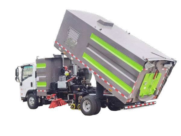 Efficient washing car using high pressure water and tilt sweep will garbage to the front of the suction cup, under the negative pressure of the fan, air in the closed circuit garbage inhaled storage in the dustbin, the whole process is the physical principle, will not produce chemical waste or garbage leakage secondary pollution to the environment, at the same time, after the spray dust effectively reduce the dust concentration in the air, solve the problem of dust pollution.
